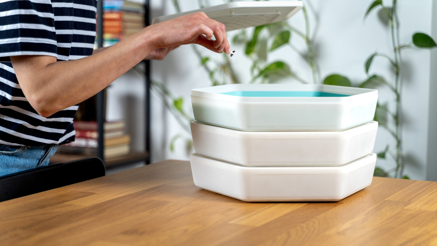 To raise mealworms, place the starter colony in the growing pods with substrate (like oats or wheat bran), maintain proper temperature and humidity, and feed them fresh vegetables. The system makes harvesting easy and mess-free.