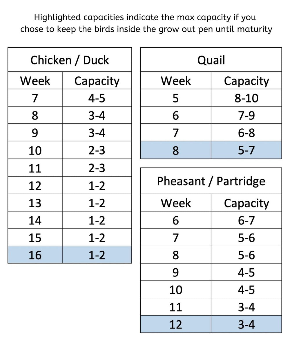 Power-washable & rust-proof stacking grow out pen is perfect for rearing pullets (chickens), quail, pheasants, partridge, ducklings, goslings, teen turkeys, or game birds. With 15" of headspace, this unit will ensure your birds grow up safely before joining the flock. To prevent bird wetting, closed nipple drinkers receive clean, algae-free water from the water tank above. To prevent foot problems, flooring is slightly larger than the brooder yet smaller than adult pens. The unit boasts an improved door locking system to prevent escapees. To remove waste efficiency, there is a deep manure tray. Red feed grill cover is included to eliminate the flinging of feed, thus saving money.