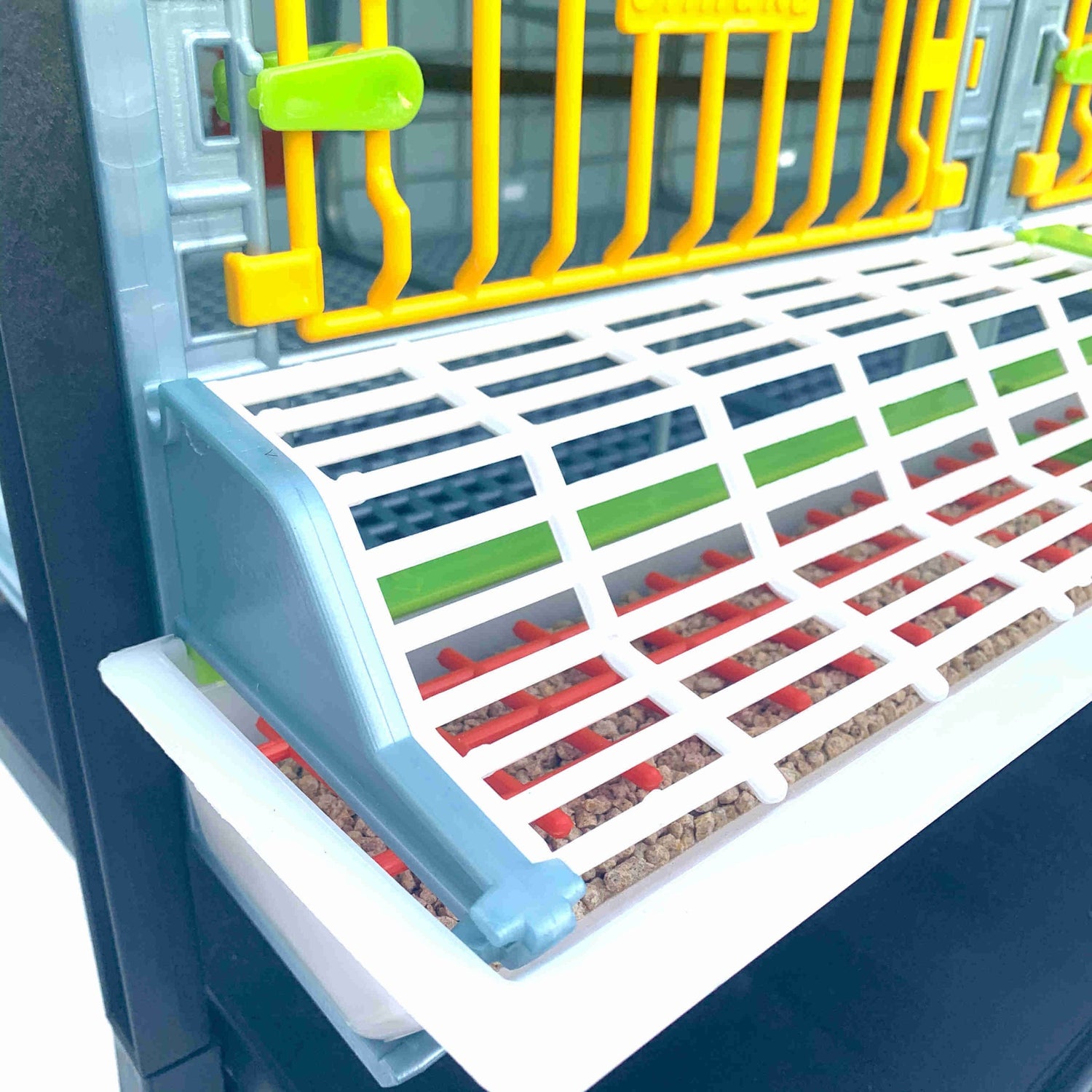 Shock-proof, red grills lay on top of removable feeding troughs to reduce feed loss, inside and outside the cage. Removable feeding troughs hold 5 pounds of feed. Customers claim to save 30% more of their feed with the flexible, shock-proof grills.