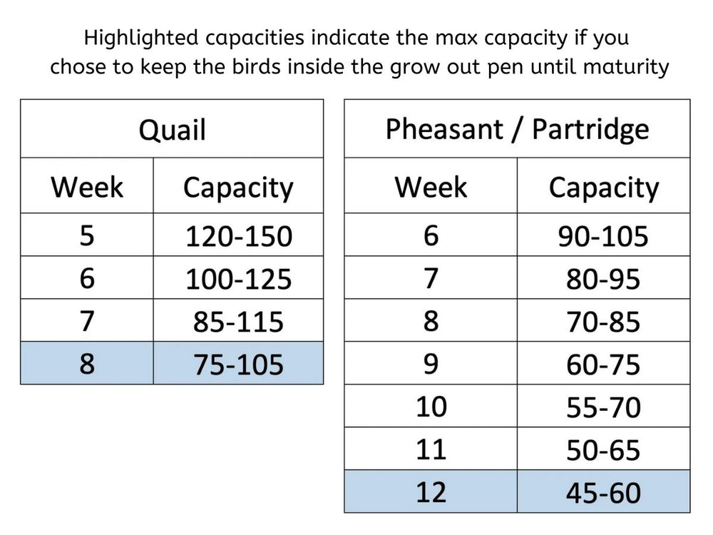 Power-washable & rust-proof stacking grow out pen is perfect for rearing teen quail, pheasants, partridge, or small game birds. For pullets (chickens), teen turkeys, ducklings and goslings, view our taller 15" models. With 9.5" of headspace, this unit will ensure your birds grow up safely before joining the flock. To prevent bird wetting, closed nipple drinkers receive clean, algae-free water from the water tank above. The unit boasts lockable wheels and an improved door locking system to prevent escapees. To remove waste efficiency, there are deep manure trays. Red feed grill covers are included to eliminate the flinging of feed, thus saving money.