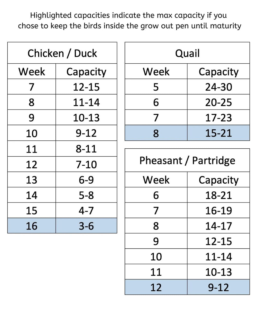 Weekly capacity is determined by your birds’ breed. If you have smaller birds, you can use our smaller, 9.5" Models. 9.5" Models