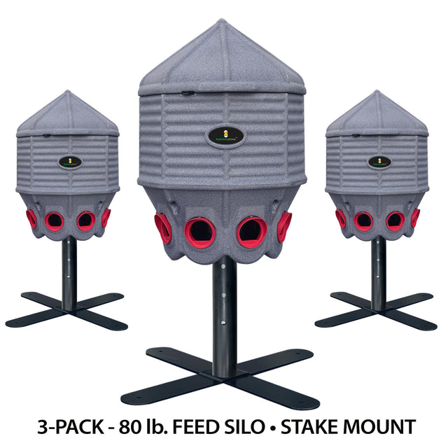 This high-capacity bundle is perfect for those seeking an efficient, low-maintenance feeding system. The versatile mounting options—X-Base for flat surfaces, Stake Mount for uneven terrain, or adjustable telescoping legs—offer flexibility to adapt to any environment. With eight feeding ports on each silo, your birds can feed simultaneously without crowding, ensuring their comfort and well-being.