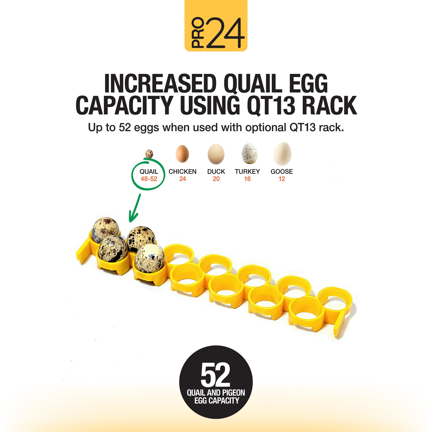 - Adaptable Capacity – 48–52 quail and pigeon, 24 chicken, 20 duck, 16 turkey or 12 goose eggs